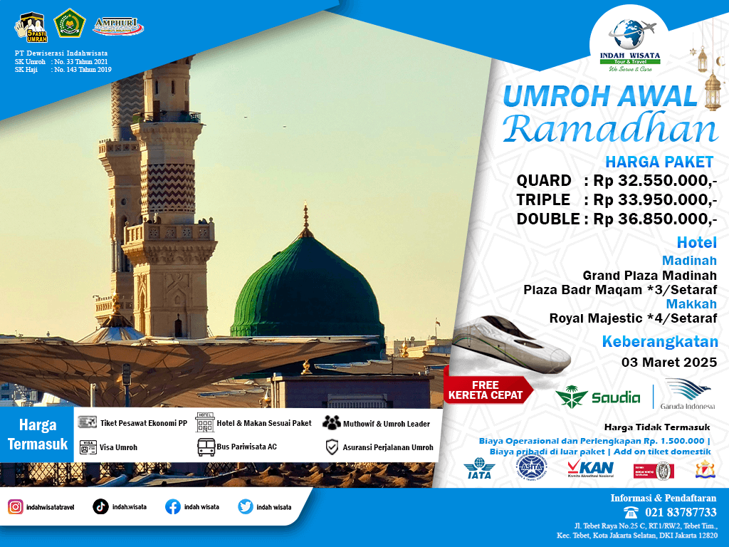- Uang muka : 50% dari harga paket pada saat pendaftaran dan biaya Fiskal,Airpot Tax